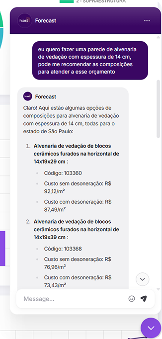A IA do Forecast conversa com você e te auxilia em todo processo de criação, planejamento e finalização do orçamento.