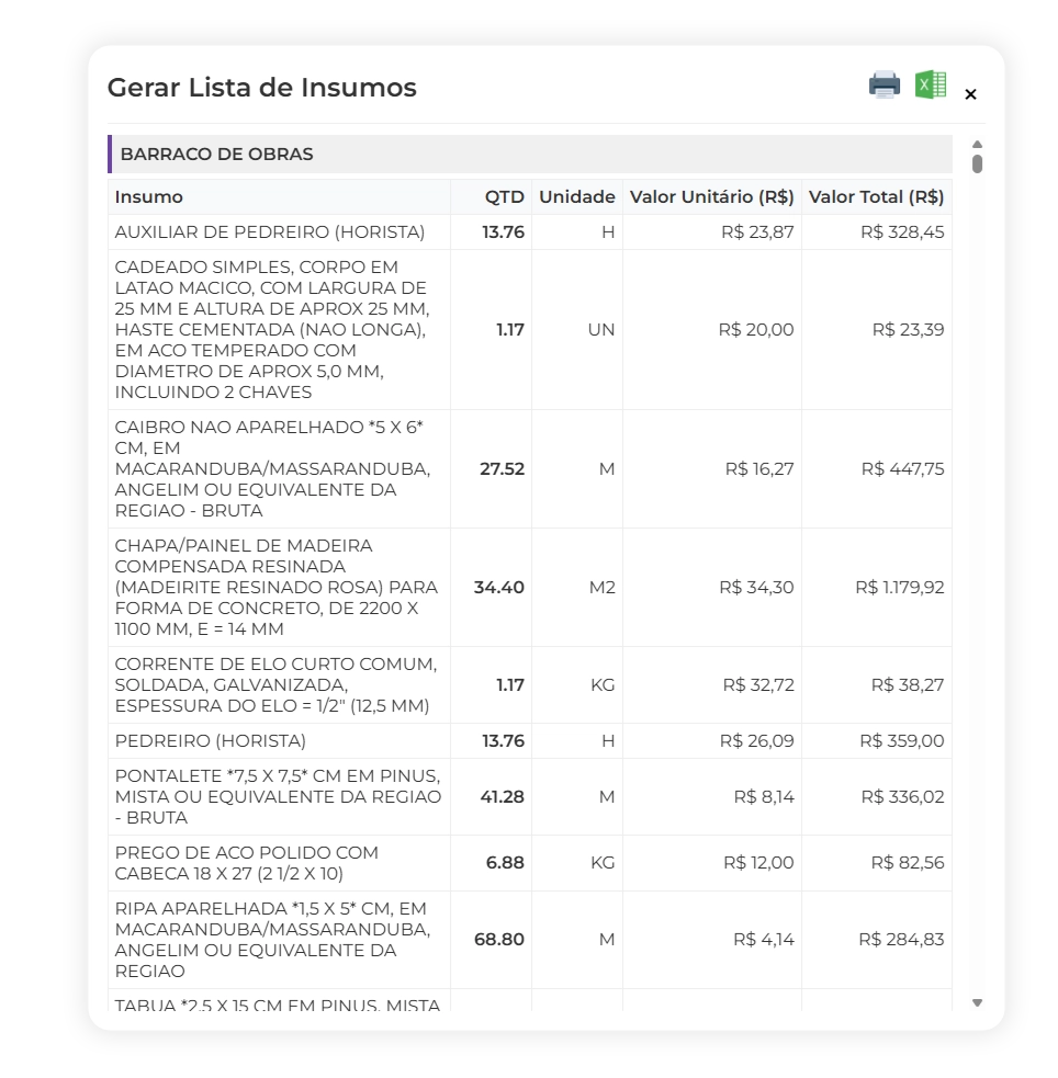 Exporte ou imprima a lista de insumos do seu orçamento.